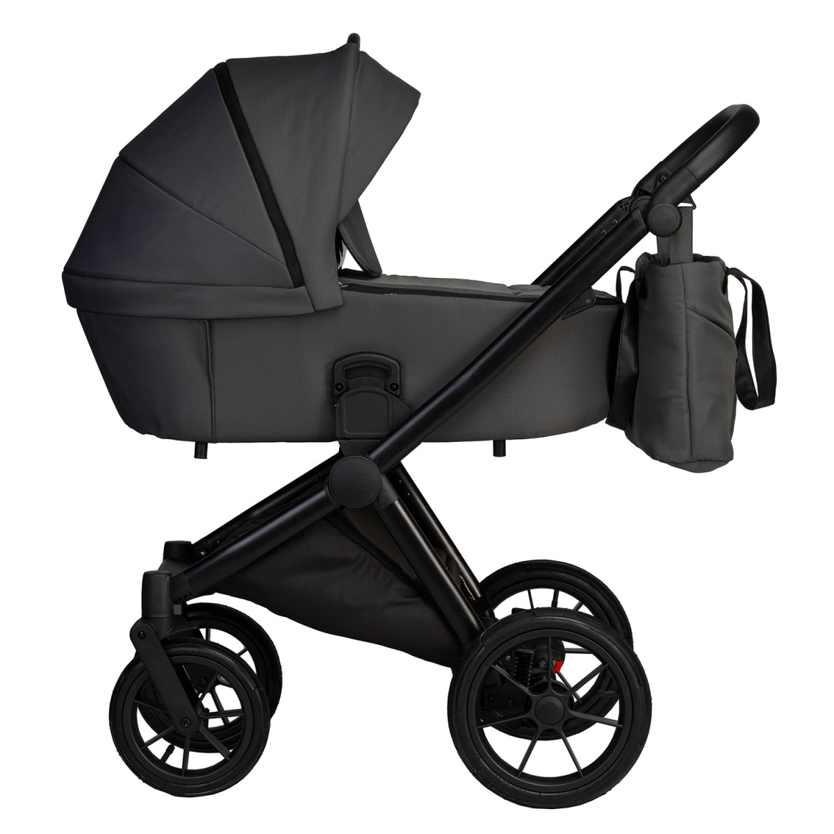 Коляска оснащена легкой и прочной рамой с мягкой амортизацией и большими надувными резиновыми колесами, которые обеспечивают плавный ход на плитке, асфальте, снегу и неровных дорогах.Передние колеса фиксируются для более удобного управления на сложных покрытиях.